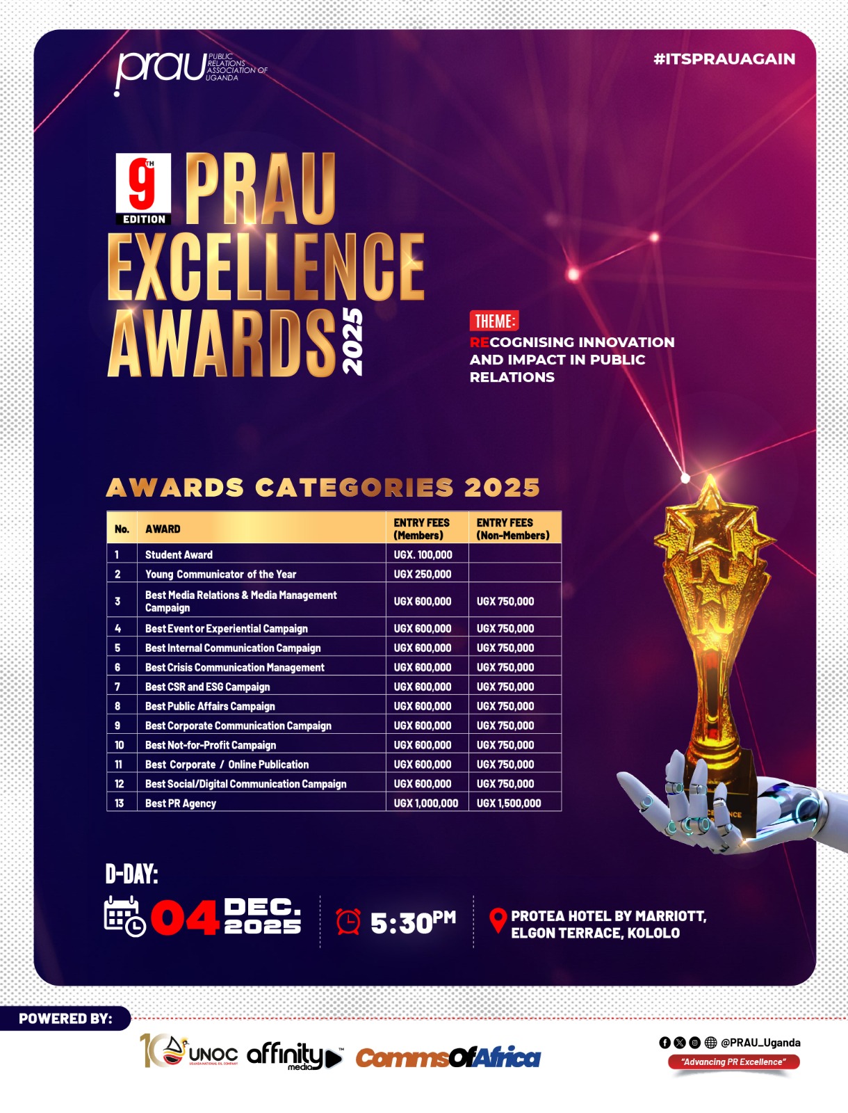 • Entry fees are required, and are dependent on the award category. Entry fees are available on the PRAU website, www.prau.ug. Entry fees must be paid in full by 5:00 p.m. on 7 November 2025. Any unpaid entries will not be judged.