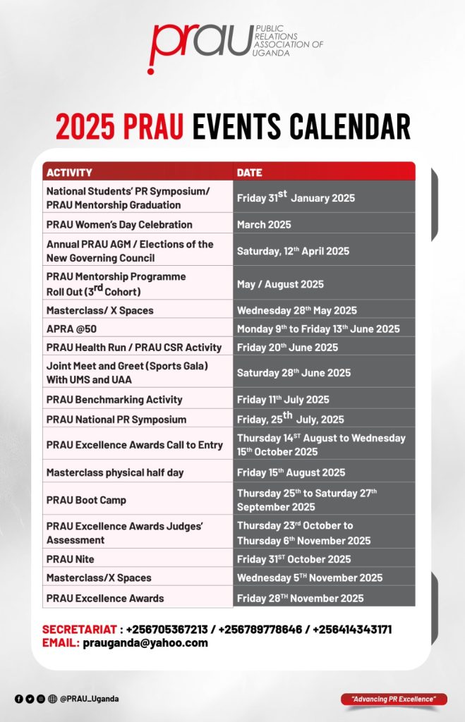 As Uganda’s premier professional body for Public Relations and Communications practitioners, the Public Relations Association of Uganda (PRAU) is thrilled to unveil its dynamic 2025 Activity Calendar, a roadmap brimming with professional enrichment, innovation, advocacy, and impact. From high-impact training sessions, thought-leadership forums, CSR initiatives, student outreach programs, and regional engagements to the highly anticipated … Continue reading Unveiling the 2025 PRAU Activity Calendar: Your Opportunity to Partner with Uganda’s Leading PR Community!