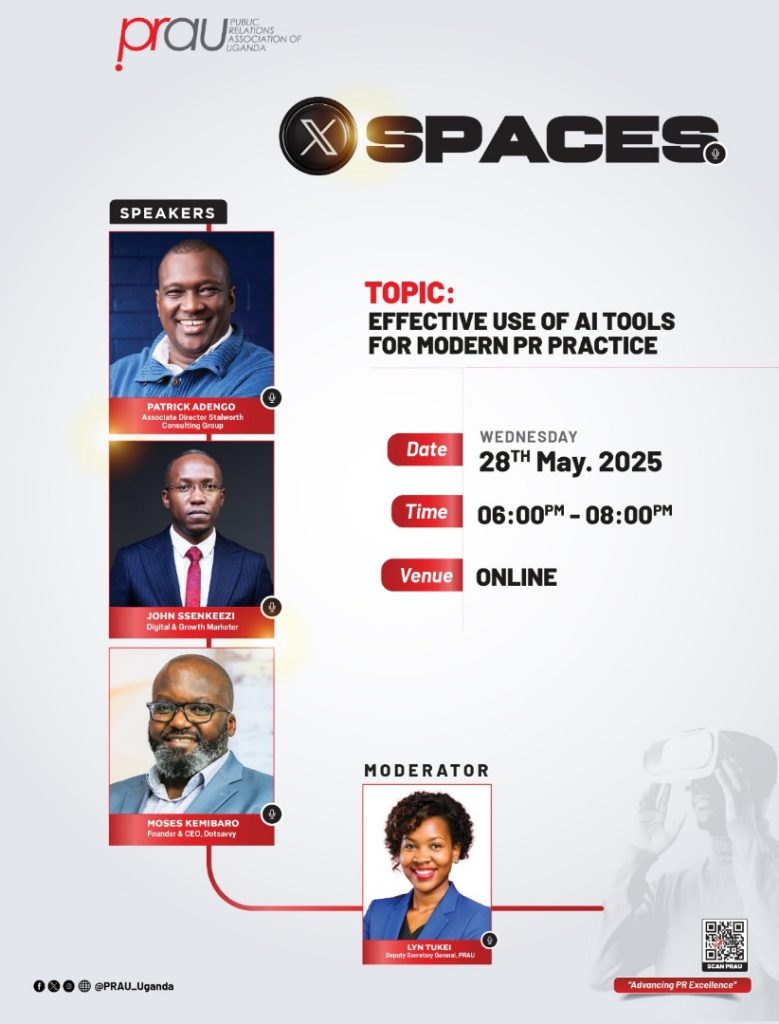 Are you ready to elevate your PR game with the power of Artificial Intelligence? The Public Relations Association of Uganda (PRAU) invites all PR professionals, communication students, corporate communication teams, agency experts, and digital storytellers to our PRAU X-Space under the theme: “Effective Use of AI Tools for Modern PR Practice.“ 📅 Date: Wednesday, 28th … Continue reading PRAU X-Space: Mastering AI Tools for the Future of PR!
